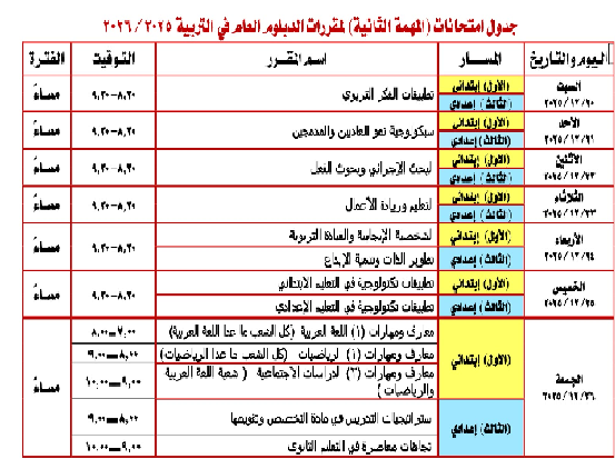 جدول امتحانات المهمة الثانية لطلاب الدبلوم العام للعام الجامعي 2026/2025 للمسار الاول ابتدائي والمسار الثالث اعدادي وثانوي