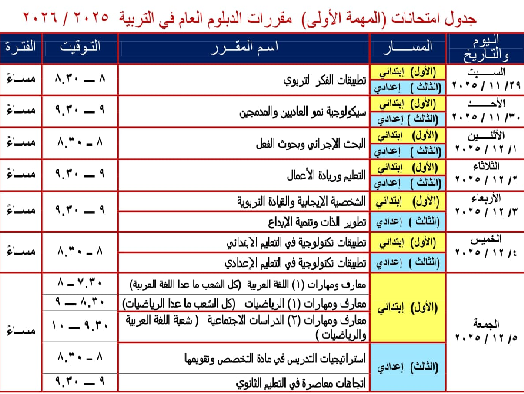 جدول امتحان المهمه الادائيه الاولى لطلاب الدبلوم العام ٢٠٢٥ بالمسارين الاول والثالث.